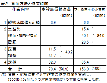 1,000m2当たり7,500株の本圃定植苗の生産・定植に要する作業時間は79.4時間で、ポット育苗の1/2程度である(表2)。また、本方式では採苗した苗の調整以外は立ち作業となり、管理に伴う屈み作業をなくすことができる。 |
