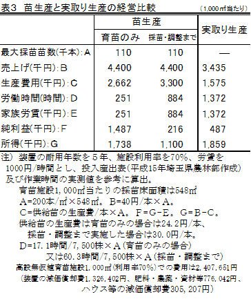 1,000m2の施設に本方式を導入し11万本を採苗(採苗数200本/m2、施設利用率70%とした場合)、1株当たり40円で販売した場合の所得を試算すると、苗を調整した場合で110万円、調整しない場合で174万円程度となる(表3)。 |