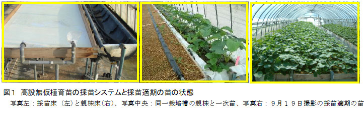 採苗床と親株床を分離、粉砕もみ殻を採苗培地とし、一次苗を親苗と同一栽培槽で生育させた高設無仮植育苗では、4月中旬親株定植で200本/m2程度の発根良好苗の生産が可能で、ポット育苗に比べ主要作業の労働時間を1/2程度に短縮できる。 |