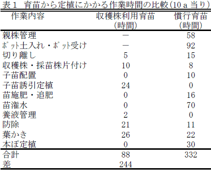 収穫株利用育苗は、慣行育苗で必要な親株管理、ポット土入れ、ポット受け及び苗潅水などの管理が不要になり、10a当りの作業時間は、慣行育苗と比較して244時間減少する(表1)。 |
