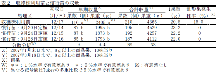 収穫株利用育苗は、慣行ポット育苗と同程度の収量を確保できる(表2)。 |