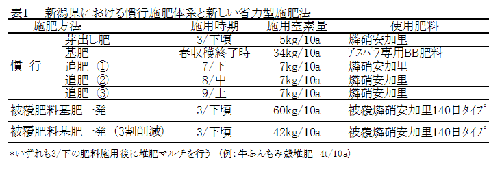 アスパラガスの立茎長期どり栽培において、窒素吸収パターンに合わせて被覆燐硝安加里肥料を使用することにより、追肥を省略し、新潟県慣行窒素施用量60kg/10aに対し、30%の窒素を削減して慣行法と同等の収量を得ることが可能である。 |
