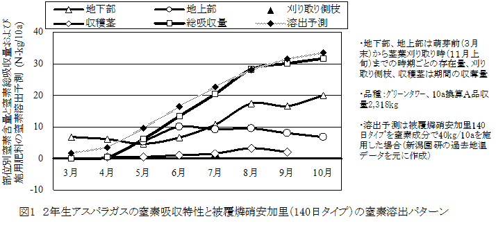被覆燐硝安加里140日タイプを10aあたり40kg施用したときの新潟県の平場地域における地温から予測した窒素溶出パターンは、アスパラガスの窒素吸収パターンとよく一致する(図1)。 |