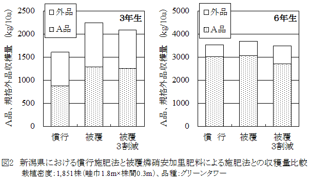 これに基づき、慣行施肥窒素量の10aあたり60kgに対し、基肥として萌芽前に3割少ない42kgを一括施用することにより(表1)、普通露地栽培の3年生および6年生株でも、慣行施肥法と同等の収穫量を確保することが可能である(図2)。 |