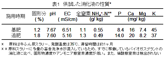 家畜排せつ物のメタン発酵処理により発生するメタン発酵消化液(以下、消化液)は、速効性窒素成分であるアンモニア態窒素を高濃度で含んでおり、肥料としての有効利用が期待されているが、野菜栽培への利用例は少ない。特に、圃場に施用する場合に悪臭発生と窒素損失につながるアンモニア揮散や、大量の水分と同時に施用する消化液由来の窒素動態についての検討例は少ない。そこで、国内主要野菜であるキャベツの栽培において、消化液を施用する場合のアンモニア揮散と土壌中での施用窒素の動態を、化成肥料を施用する慣行栽培と比較する。 |