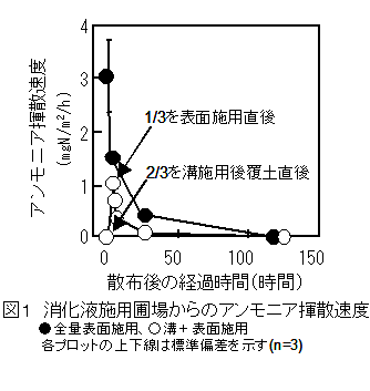 化成肥料施用時にはアンモニア揮散は認められないが、表1に示す消化液を表面施用するとアンモニアが揮散する(図1)。しかし、消化液を溝施用後、すみやかに消化液が隠れる程度覆土することにより、その後のアンモニア揮散をほぼ抑制できる(図1)。 |