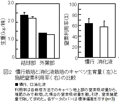 初夏どりキャベツの結球部、外葉部の生重は、慣行栽培と消化液栽培の間に5%水準で有意差は認められない(図2左)。差し引き法で評価した地上部による施用窒素の吸収利用率にも5%水準で有意差は認められない(図2右)。 |