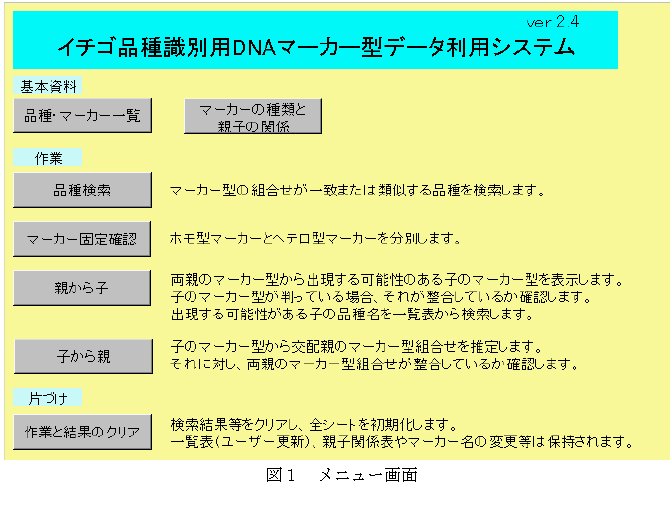 図1に示すとおり、プログラムは「品種検索」、「マーカー固定の確認」、「親から子」の推定および「子から親」の推定の4つの機能を有する。それぞれ、マーカーのデータは1個ずつ入力するだけでなく、登録済みの一覧表から品種名を選択することによって一括入力することもできる。 |
