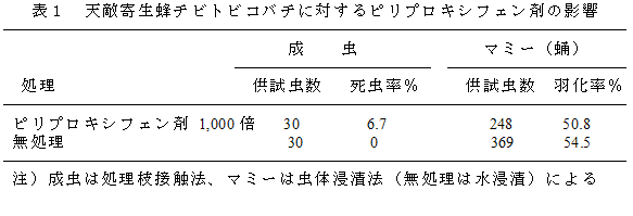 ピリプロキシフェン剤の天敵寄生蜂チビトビコバチの成虫及びマミー(蛹)に対する殺虫作用は認められない(表1)。 |