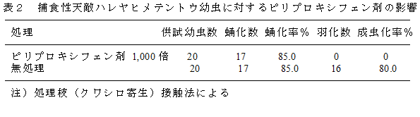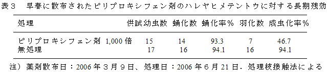 ピリプロキシフェン剤1,000倍液は、ハレヤヒメテントウ幼虫に対する強い羽化阻害作用があり(表2)、この作用は3ヶ月以上持続する(表3)。 |