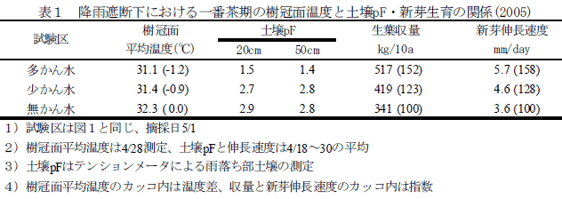 一番茶生育期において、降雨がないとかん水量が少ないほど日中の樹冠面温度は上昇する。土壌pFに差が生じない程度の少量のかん水でも樹冠面温度は低下し、水ストレスは軽減される。 | ||||||||