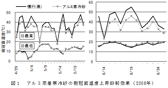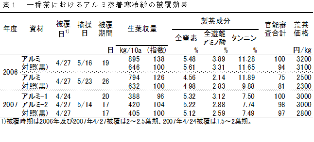 アルミ蒸着フィルムで表面加工された寒冷紗によるてん茶の直がけ被覆は、樹冠面の温度上昇を抑制し、品質を向上させる。収量は同等もしくは増収する。 | ||||||||