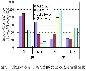 埼玉県在来のらぼう菜3種(比企、都幾川、野口種苗)における栄養成分は茎に比べて葉に多く、糖含量は葉に比べて茎に多い。ゆで後の成分の損失は葉に比べ茎が少なく、食味評価では、比企と野口種苗が甘み・食感・おいしさの評価が高い。 | ||||||||