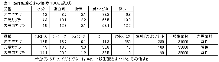 乾燥温度50℃で河内赤カブ、穴馬カブラ、古田苅カブラを乾燥粉末化すると、いずれも糖分をかなり多く含み、また、河内赤カブ粉末はアントシアニン含量、イソチオシアネートの生成量も高い(表1)。 |
