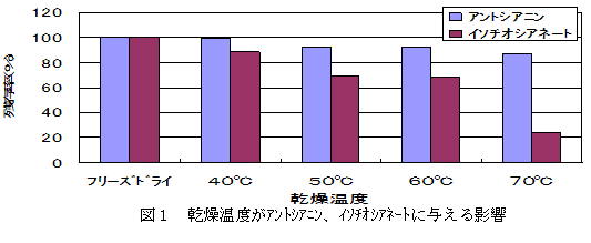 カブをスライス(3mm程度)後60℃以下で熱風乾燥することで、赤い色素のアントシアニンは凍結乾燥と比較しておよそ90%以上、辛味成分のイソチオシアネートは同様におよそ70%以上を保持したまま簡便に乾燥できる。70℃では、アントシアニンは80%以上残存するが、イソチオシアネートはほとんど生成しなくなる(図1)。 |