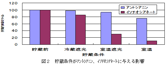 カブの乾燥粉末を冷蔵遮光条件で保存することで、1年後でも、アントシアニンは95%以上、イソチオシアネートは80%以上を保持できる。アントシアニンは室温下遮光無しでも、70%以上保持される(図2)。 |