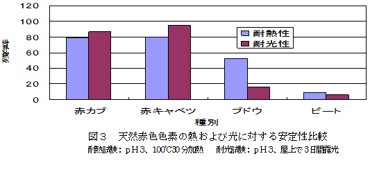 赤カブのアントシアニンは、市販赤キャベツ色素とほぼ同程度の熱安定性、光安定性を示す(図3)。 |