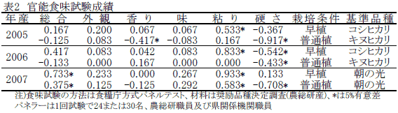 飯米は粘りが強く、軟らかく、「コシヒカリ」、「キヌヒカリ」並の極良食味である(表2)。 |