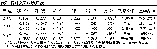 飯米は外観が優れ、6月下旬移植では「朝の光」に優り、「キヌヒカリ」並の良食味である(表2)。 |