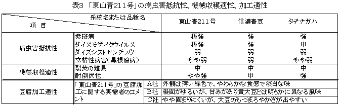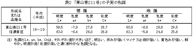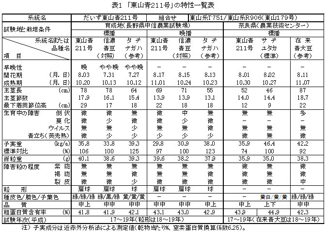 だいず「東山青211号」は「信濃青豆」より晩熟な青大豆系統である。種皮、臍、子葉が緑色で外観品質に優れ、豆腐の食味が良い。着莢位置が高く倒伏は少なく、ダイズモザイク病と紫斑病に抵抗性である。 | ||||||||||||||