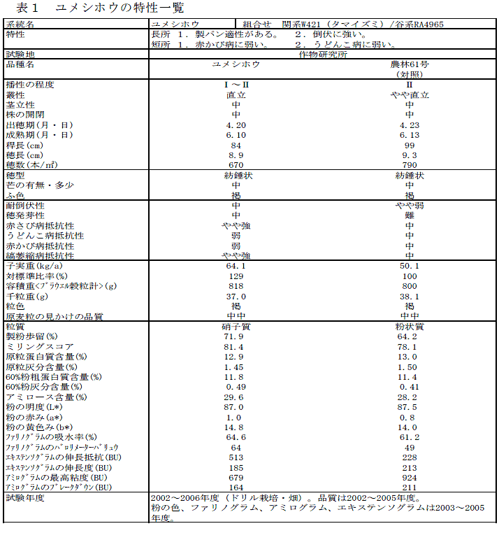 製パン適性をもつ温暖地向け硬質小麦新品種「ユメシホウ」 | ||||||||||||||