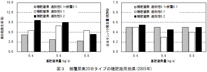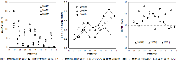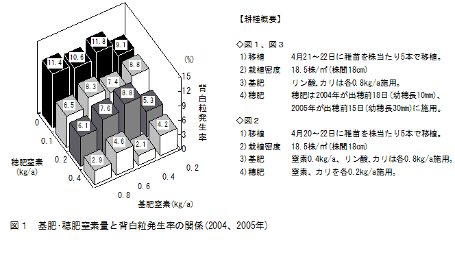 背白粒は穂肥窒素量が多いほど発生が減少し、穂肥施用時期では出穂前9~12日の施用が発生を最も減少させる。また、速効性窒素0.1kg/aに加え、被覆尿素30日タイプを窒素0.1kg/a同時に施用することで背白粒の発生をさらに抑制できる。 | ||||||