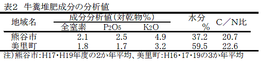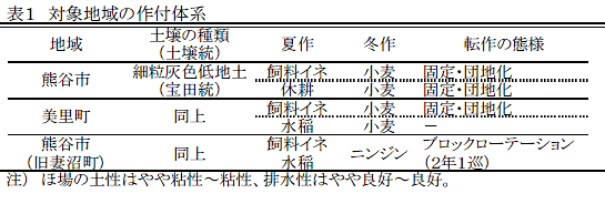 二毛作地帯を主体に飼料イネ栽培の導入が進み、耕畜連携体制により、飼料イネ作付ほ場へ地域内畜産農家由来の牛糞堆肥の施用が行われているが、二毛作栽培体系では、堆肥施用と飼料イネ移植作業が競合することから、施用時期は飼料イネ収穫後から小麦茎立期前までである。 | ||||||||