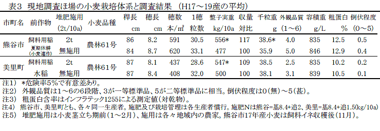 二毛作での作業競合を回避するため、飼料イネ作付け後に牛糞堆肥2t/10aを施用することにより、あと作の小麦の収量及び外観品質は向上し、子実粗蛋白質含有率もランク基準に近づく。 | ||||||||