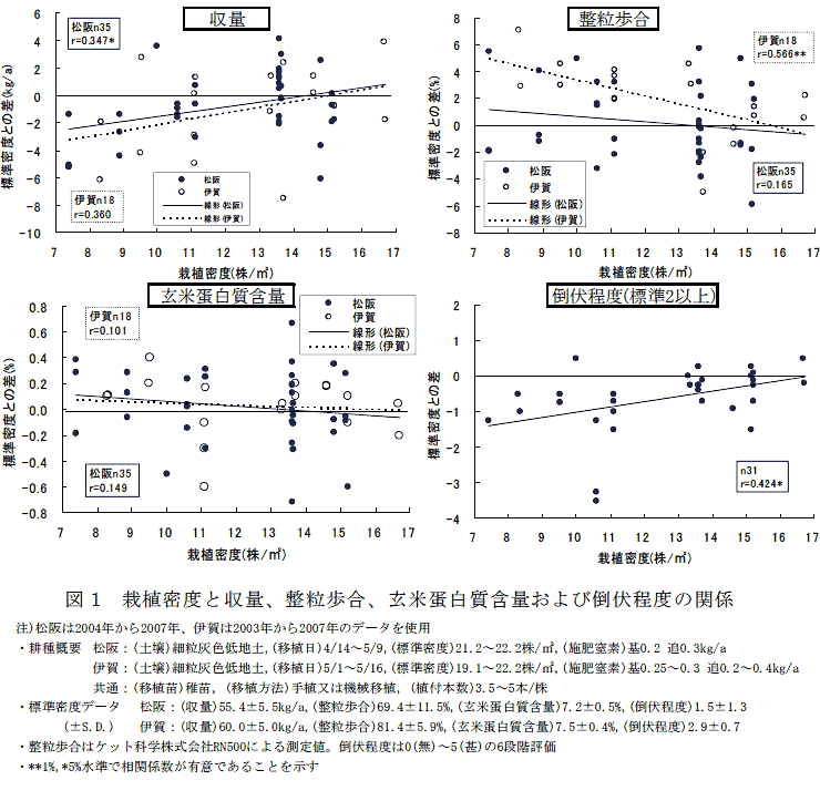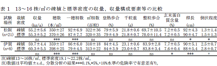 コシヒカリの栽植密度は13株/m2までであれば、21株/m2程度の標準密度と比較して収量差は認められず、整粒歩合および玄米蛋白質含量への影響は小さく、倒伏は軽減される。 | ||||||||||