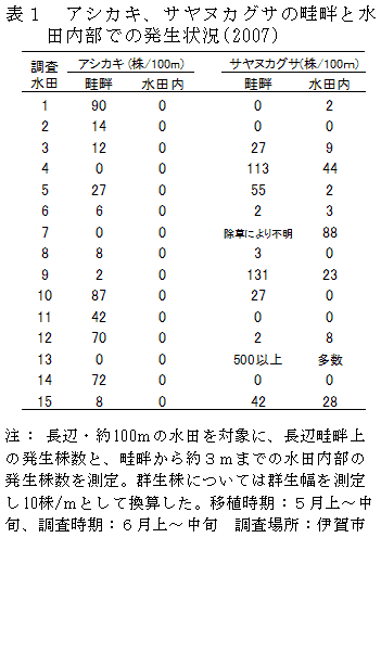 イネ科雑草アシカキの畦畔から水田内への侵入は水稲除草剤で抑制できる | ||||||||