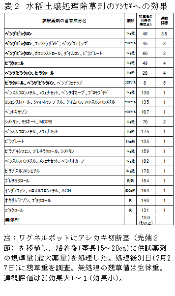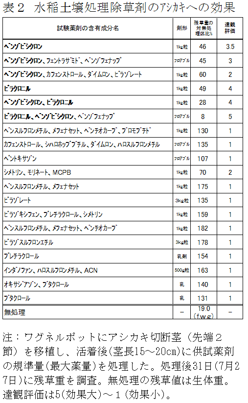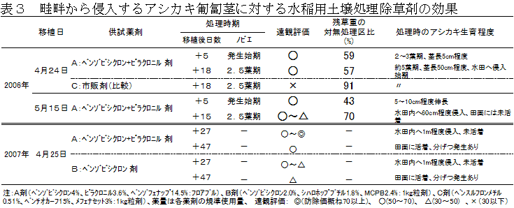 イネ科多年生雑草アシカキの発生源は畦畔の越冬株であり、移植水稲では畦畔から侵入する匍匐茎が問題となる。ベンゾビシクロン、ピラクロニルを含む水稲用除草剤を水田内に散布することにより水田内へ侵入する匍匐茎の伸長を抑制できる。 | ||||||||
