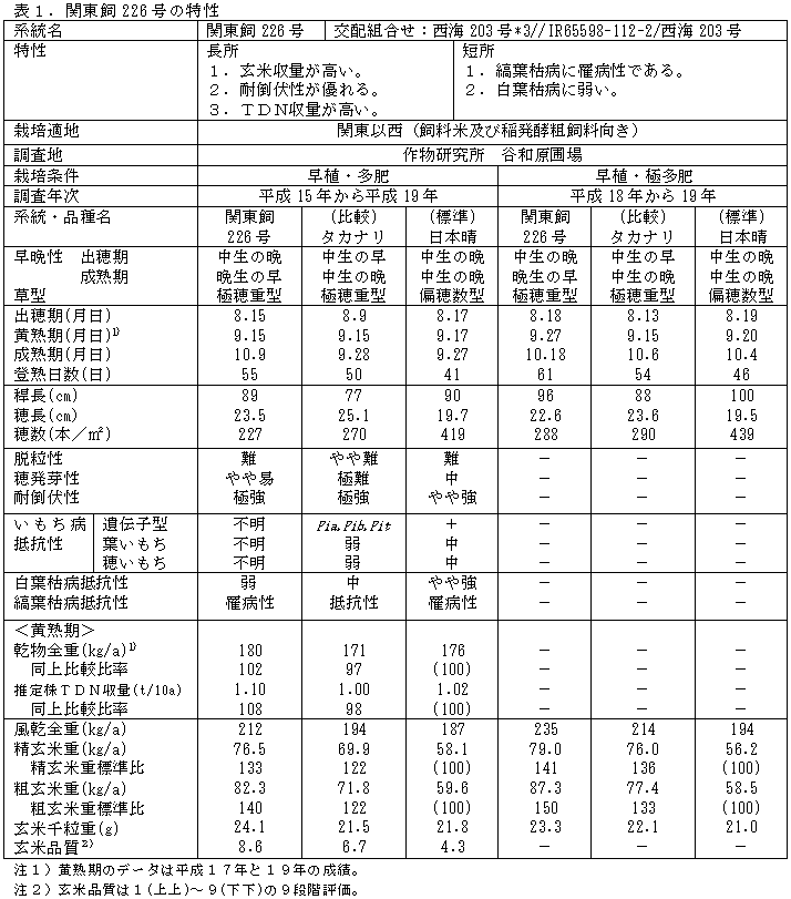 「関東飼226号」は収量性の向上を目標として国際稲研究所の育成系統「IR65598-112-2」を一回親とし、多収の「西海203号」を戻し交配して育成された飼料米・飼料イネ向け系統である。 |
