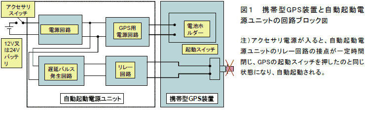自動起動電源ユニットの装着が可能な携帯型GPSは、G社製 eTrex-Vista CXもしくはHCX (英語、日本語版)に限られる。 |