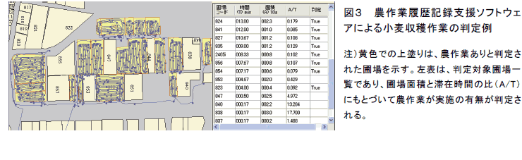 携帯型GPSと自動起動電源ユニットを用いることで、農業機械の作業軌跡データの自動収集が可能である。また、農作業履歴記録支援ソフトウェアにより農業機械の軌跡データとポリゴン圃場図から農作業が実施された圃場を自動判定できる。 |