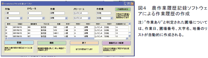 農作業履歴記録支援ソフトウェアは、GPSからパソコンへのデータの転送・変換、農作業実施圃場の自動判定、農作業履歴記録を行うプログラム等で構成される。農作業履歴記録では、実施圃場リスト(作業日、圃場番号、地番)は軌跡データから自動的に作成されるため、作物名、作業種類、作業機の種類等について選択入力する必要がある(図4)。 |