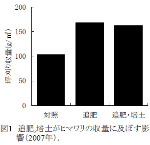 ナタネ後ヒマワリでは、播種後1ヶ月の追肥によって収量が増加する(図1)。追肥は葉、花を大きくすることで増収に寄与する。落ち種ナタネが発生した場合には、培土除草を行う。 |