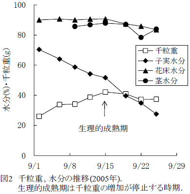 ヒマワリの千粒重は、苞が褐変した時期(表1:R9)以降増加しないとされている。しかし、その時期の花床、茎水分は80%程度と高く、機械収穫は困難である(図2)。花床、茎水分、さらに2週間程度は高いまま維持される。 |