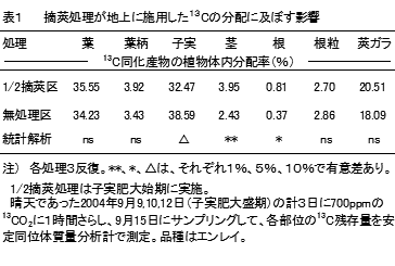 子実肥大期には大豆の光合成産物の4割程度は莢実に分配され、根系への分配は少ない。しかし、摘莢処理により光合成産物の受容先(シンク)である莢実を減らすと光合成産物は根系や茎により多く配分される(表1)。 |