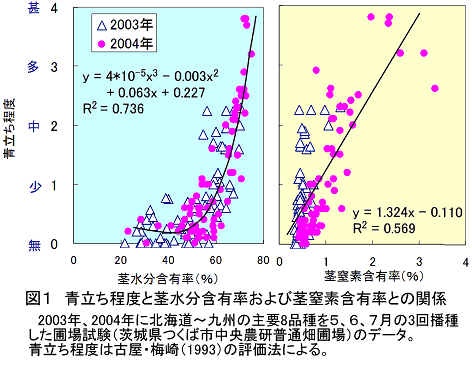北海道~九州地域の8主要品種を3播種時期で栽培した圃場実験では、青立ち程度は無~甚に広く分布し、茎の窒素含有率よりも水分含有率と青立ち程度はより密接な関係にある(図1)。コンバイン収穫適期の目安となる成熟期茎水分が約50%以下では、茎の窒素含有率は1%以下、青立ちが「少」以下である。 |