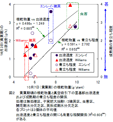 主茎の伸育型と青立ち発生程度は密接な関係にあることが知られている。有限伸育型品種(エンレイ)では、摘莢処理を行うと根乾物重が増大して青立ちが著しくなるが、無限伸育型品種(Williams)は摘莢処理を行っても茎乾物重が増大するので根乾物重は増大せず、青立ちも促進されない(図2)。黄葉期の根重が大きいと根系の吸水力の指標となる真空吸引下の出液速度が高く、成熟期の青立ち程度も著しくなる。 |