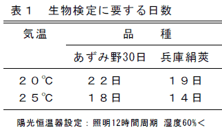兵庫絹莢」は、従来から用いられている「あずみ野30日絹莢PMR」に比べ、展葉が速いため3~4日早く検定できる。更に20℃より、高温の25℃で栽培すると4~5日早くなり、14日間で検定が可能となる。(表1) |