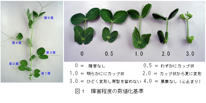 H17年度成果情報「牛ふん堆肥に残留するクロピラリド等ホルモン型除草剤の生物検定法」を参考にサヤエンドウを栽培する。不完全葉を除く5段の各展開葉について、図1に示した基準により障害程度を数値化する。 |