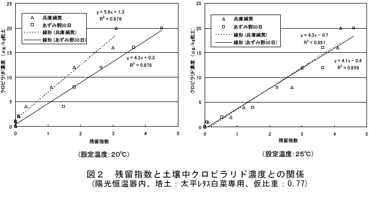 各展開葉の障害程度を次式にあてはめ残留指数を算出する。 残留指数=(第1葉×5+第2葉×4+第3葉×3+第4葉×2+第5葉×1)/5 この残留指数は、土壌中のクロピラリド濃度と高い相関関係がある(図2)。 |