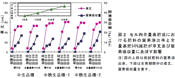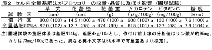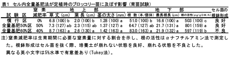 [キーワード]ブロッコリー、セル内全量基肥、窒素50%減肥、リン酸・カリ蓄積 |