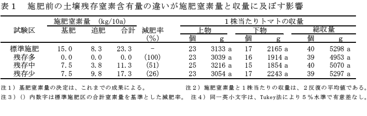 標準施肥区の総施肥窒素量に対する減肥率は、残存多区が100%、残存中区が51%、残存少区が26%である(表1)。 |