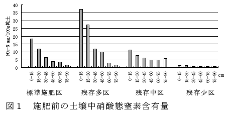 施肥前の土壌硝酸態窒素含有量は、表層(0~15cm)で残存多区が35mg/100g前後、標準施肥区及び残存中区で15mg/100g前後、残存少区で3mg/100g前後である。(図1)。土壌硝酸態窒素含有量の土壌分析に基づいた基肥窒素量は、残存多区で0.0kg/10a、残存中区及び残存少区で7.5kg/10aである。 |