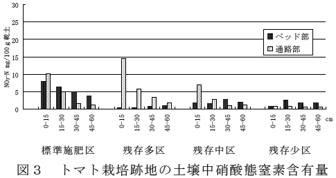 トマト栽培跡地の土壌中硝酸態窒素含有量は、栽培ベッド部で標準施肥区に比べ残存各区で少ない。同様に、通路部では標準施肥区に比べて残存多区で多く、残存中区でやや少なく、残存少区では少ない(図3)。 |