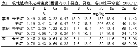 現地の発症株及び未発症株の葉身、葉柄、茎の養分含量を比較すると、発症株は全ての部位で、リン含量が未発症株の約2倍の値を示す。カリ及びその他の元素濃度には差が見られない(表1)。 |