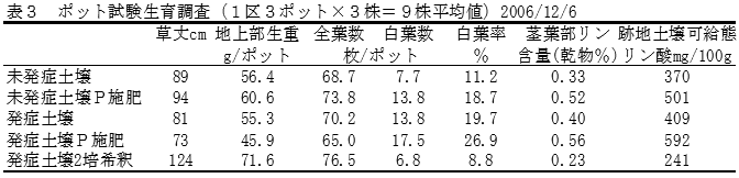 現地土壌(褐色低地土)を用いたポット試験の結果、発症土壌、未発症土壌とも、リン酸を増肥(重焼燐および過石を併用し、リン酸成分で200mg/100gおよび300mg/100g相当をポット土壌に施肥)することによって、白化症状はさらに助長される。また茎葉部リン含量も高まる。発症土壌を非耕地土壌(火山灰土)で2倍に希釈した処理区は、白化症状の発生が最も少なく、生育良好となる(表3)。 |