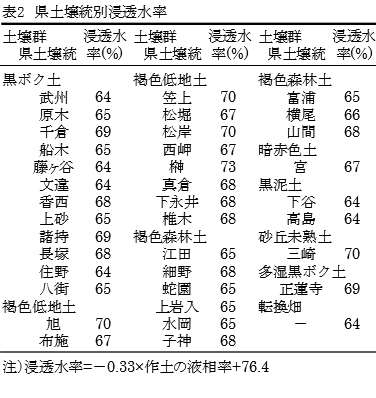 降水量が浸透水量となる割合を浸透水率とした。表層腐植質黒ボク土である八街統では浸透水率が65%、作土の液相率が34%、中粗粒褐色低地土の旭統ではそれぞれ70%、19%である(表1)。両土壌統の液相率(土壌モニタリング調査で得られた平均値)と浸透水率の関係式(浸透水率= -0.33×液相率 + 76.4)に、各種畑土壌の液相率を代入して、県土壌統別に浸透水率を求めた(表2)。 |